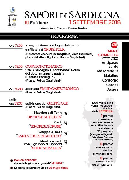 Torna il 1 settembre nel centro storico di Montalto di Castro “Sapori di Sardegna”, la caratteristica festa sulle tradizioni culinarie e popolari della cultura sarda. L’appuntamento avrà inizio alle ore 17:00 a via