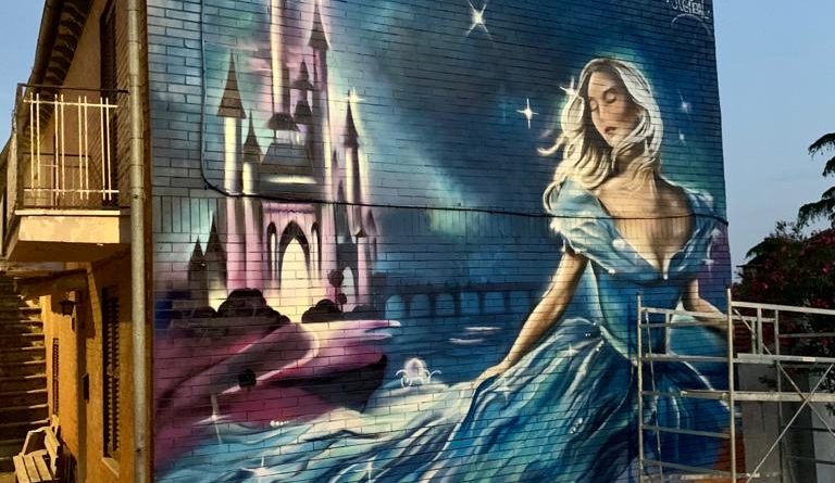 La prima artista ad arrivare a Sant’Angelo è stata Stefania “Stereal” Marchetto, già autrice de La spada nella roccia. La Marchetto, milanese, è stata così brava a far risaltare come protagonista la sua Cenerentola ricca di colori che il suo murale può notarsi persino dalle terrazze del castello Costaguti, nella vicina Roccalvecce. Un grazie a Marco Corba di Grotte Santo Stefano che col suo elevatore ha reso possibile l’opera.