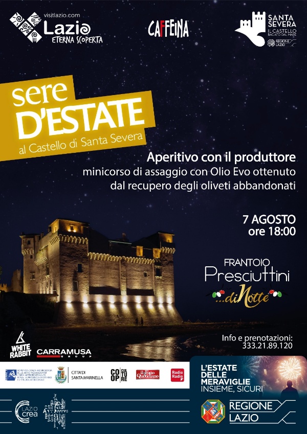 Venerdì 7 agosto, a partire dalle 18.00 nello spazio all’interno del borgo, nell’area spettacoli del Festival Sere d’Estate, al Castello di Santa Severa, spazio della Regione Lazio gestito da LAZIOcrea in collaborazione con il Comune di Santa Marinella, Pierluigi Presciuttini, propone al pubblico un incontro durante il quale parlerà di Olio Evo e del Recupero degli Oliveti Abbandonati.