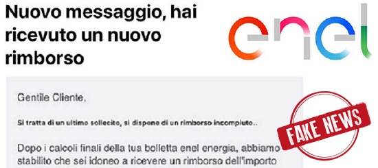 “Dopo i calcoli finali della tua bolletta Enel energia, abbiamo stabilito che sei idoneo a ricevere un rimborso dell’importo di 128,04 euro”.