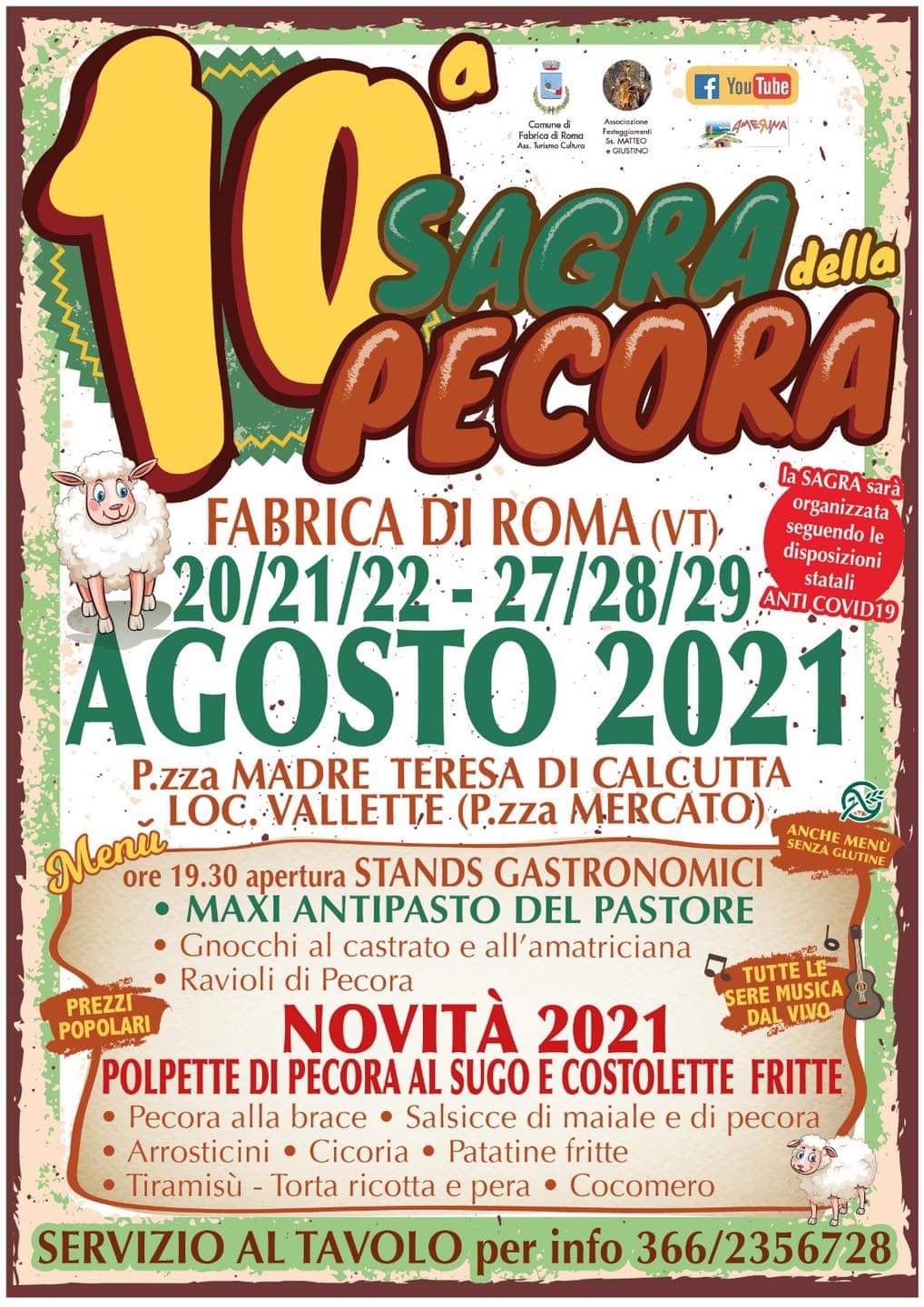 Festeggia i primi dieci anni la Sagra della Pecora di Fabrica di Roma, la manifestazione dedicata a promuovere una delle prelibatezze del territorio attraverso sei giorni, negli ultimi due fine settimana di agosto, di grande festa. Nella piazza principale del Mercato, (piazza madre Teresa di Calcutta, località Vallette), ai piedi del centro storico di Fabrica, il Comitato dei Festeggiamenti dei SS. Matteo e Giustino, ente organizzatore dell’iniziativa insieme all’assessorato alla cultura del comune di Fabrica di Roma, rinnoverà la formula – mai interrotta in questi anni e nel massimo rispetto delle misure di distanziamento e regolamenti sanitari in periodo di emergenza Covid – che associa una molteplice proposta gastronomica a tema ad intrattenimenti di musica dal vivo.