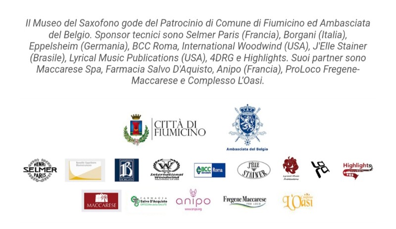 Il Museo del Saxofono gode del Patrocinio di Comune di Fiumicino ed Ambasciata del Belgio. Sponsor tecnici sono Selmer Paris (Francia), Borgani (Italia), Eppelsheim (Germania), BCC Roma, International Woodwind (USA), J’Elle Stainer (Brasile), Lyrical Music Publications (USA), 4DRG e Highlights. Suoi partner sono Maccarese Spa, Farmacia Salvo D’Aquisto, Anipo (Francia), ProLoco Fregene-Maccarese e Complesso L’Oasi.