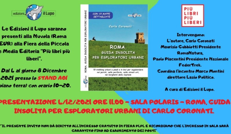 Sarà presentato al pubblico della Fiera della Piccola e Media Editoria “Più libri più liberi” il volume Roma, Guida insolita per esploratori urbani, l’ultima opera di Carlo Coronati, con il patrocinio di RomaNatura, che propone una mappatura di 15 itinerari di trekking urbano alla ricerca dell’immersione per incanto, a partire dall’orientamento tracciato dalla bussola del proprio corpo. La presentazione avrà luogo sabato 4 dicembre 2021 alle ore 11.00 presso la Sala Polaris de “La Nuvola”. Insieme all’autore interverranno Maurizio Gubbiotti, Presidente RomaNatura e Paolo Piacentini, Presidente Nazionale FederTrek. Coordina l’incontro Marco Montini, direttore Lazio Politico.