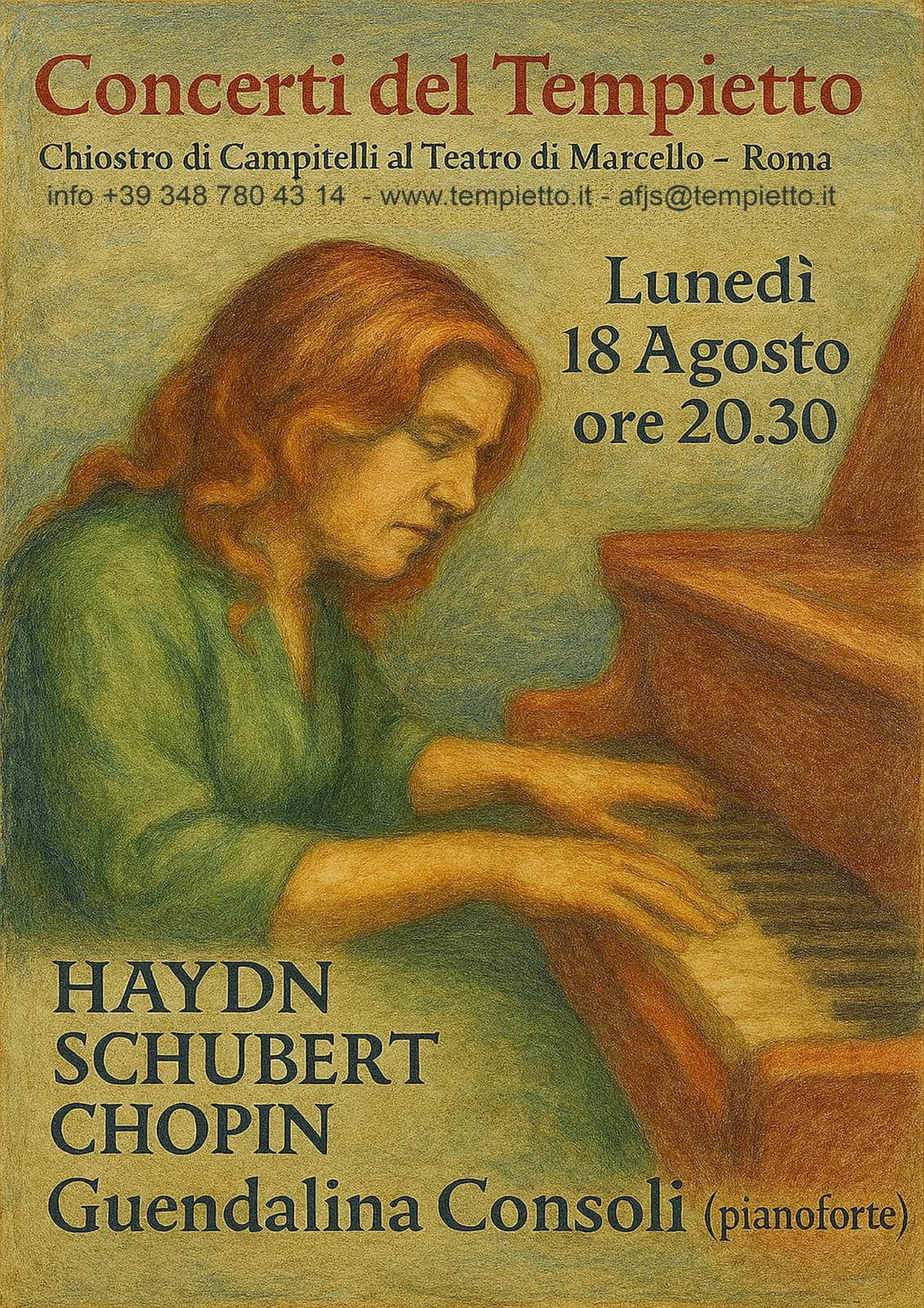 In occasione degli apprezzati Concerti estate 2025, che presentano artisti venuti da ogni angolo del mondo, Guendalina Consoli offrirà al pubblico un concerto sulle note di Hydn, Schubert e Chopin: F.J. Haydn (Sonata in Fa Maggiore); F. Schubert (4 Improvvisi op. 90); F. Chopin (3 Notturni op. 9; Valzer op. 64 n. 2).