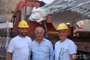 Sono da poco passate le 9:00, è caldo, ma ai Fiorillo, che hanno scortato la Macchina a bordo delle loro moto, poco importa e subito si mettono all’opera, come documenta il servizio fotografico di Mariella Zadro.