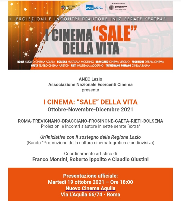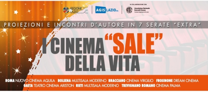 I CINEMA: “SALE” DELLA VITA è un’iniziativa, con il coordinamento artistico di Franco Montini, Roberto Ippolito e Claudio Giustini, che da ottobre a dicembre, proporrà in sette comuni del Lazio sette diversi appuntamenti, ognuno mirato a far rivivere il luogo della visione cinematografica come vero e proprio scambio culturale con lo spettatore. L’iniziativa si propone di dimostrare come la sala sia un importantissimo luogo di aggregazione sociale, dove il cinema si incontra con le diverse espressioni artistiche: letteratura, musica, teatro. Per questo motivo ciascun appuntamento, oltre alla proiezione di un film, prevede incontri dal vivo, esibizioni, confronti a più voci, con la partecipazione di cineasti e non solo.
