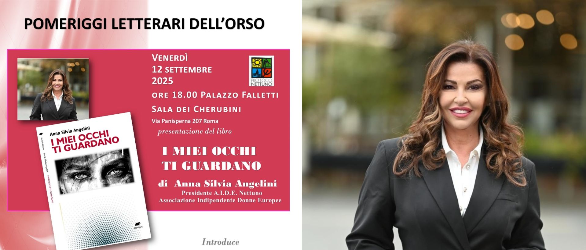 Il prossimo venerdì 12 settembre, alle ore 18:00, a Roma, si terrà la presentazione di “I miei occhi ti guardano”, il nuovo libro di Anna Silvia Angelini. L’evento, che fa parte della rassegna “Pomeriggi letterari dell’Orso”, avrà luogo nella prestigiosa cornice di Palazzo Falletti a Roma.