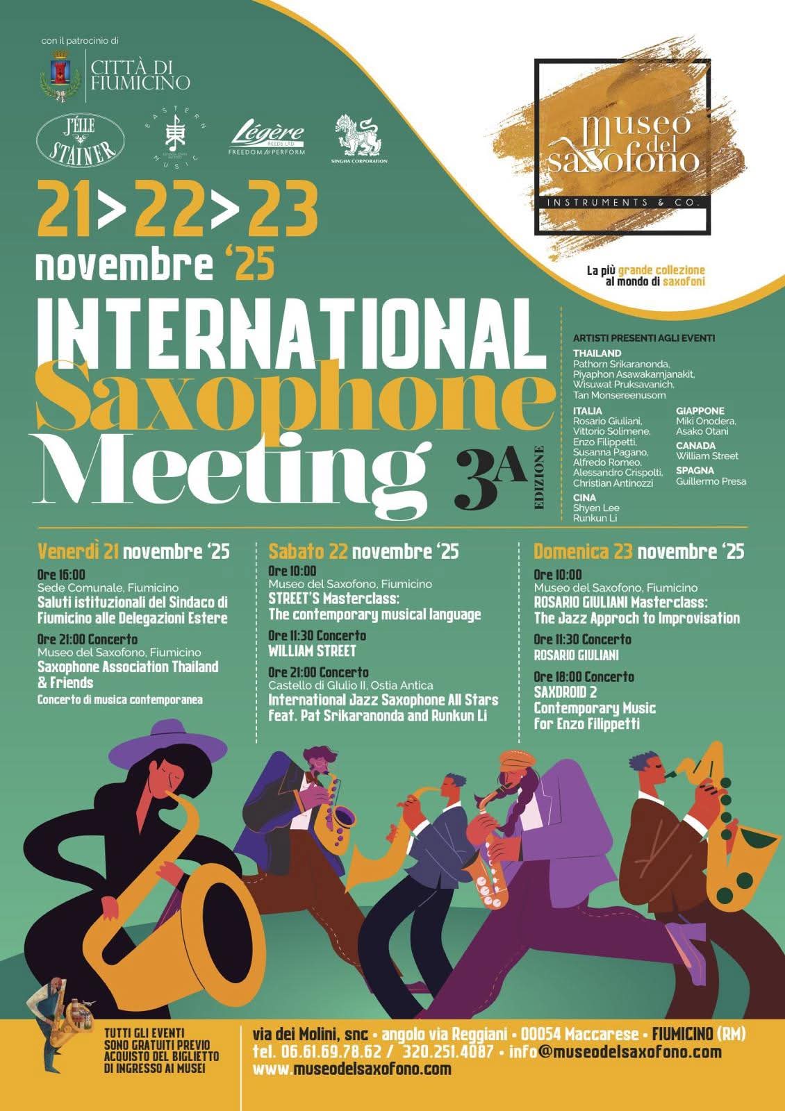 Dal 21 al 23 novembre il Museo del Saxofono di Fiumicino e il Castello di Giulio II a Ostia Antica ospiteranno la 3ª Edizione dell’INTERNATIONAL SAXOPHONE MEETING, una manifestazione internazionale dedicata alla divulgazione del patrimonio museale e alla valorizzazione del saxofono come strumento artistico e culturale globale.