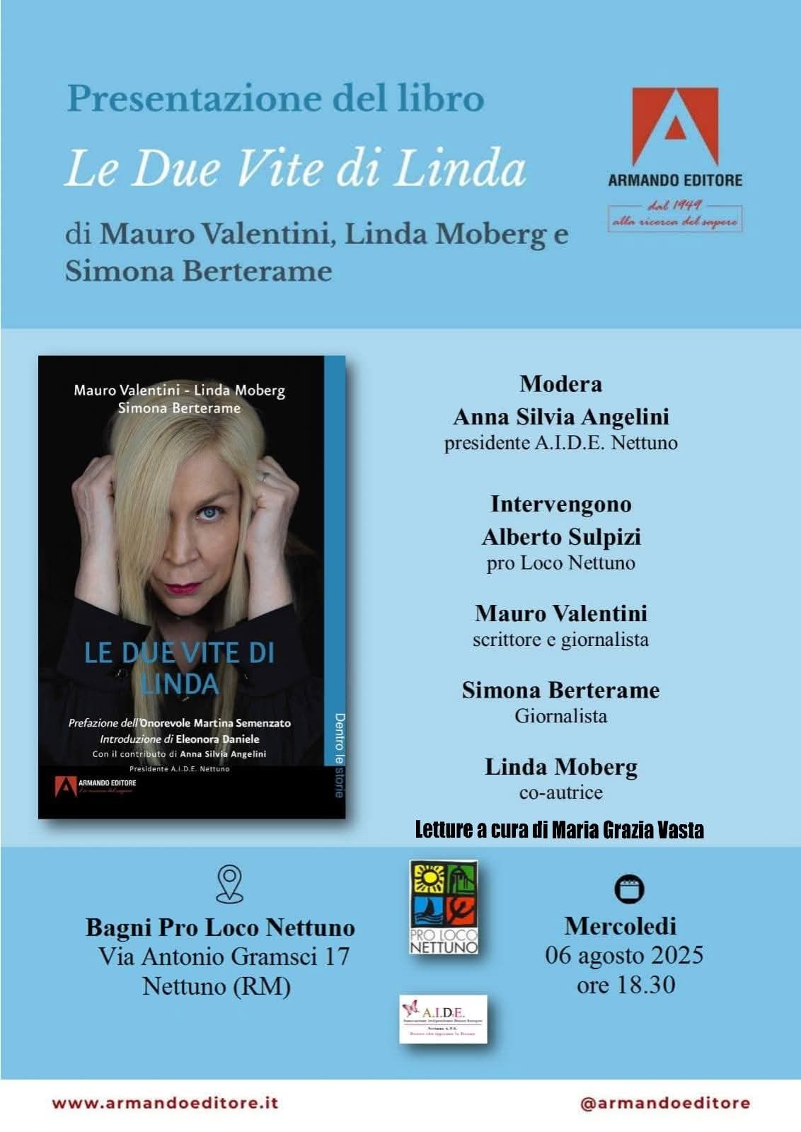 Il 6 agosto alle 18:30, presso la spiaggia Proloco di Nettuno in occasione della rassegna letteraria Libri sotto le stelle verrà presentato il libro “Le due vite di Linda” (Armando Editore), scritto da Linda Moberg con i giornalisti Simona Berterame e Mauro Valentini.