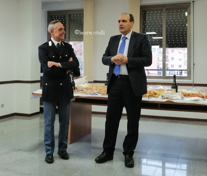 Sì, Claudio Maria De Santis da domani in quiescienza ed in sala convegni, l’abbraccio delle colleghe e dei colleghi, per congratularsi con il Sovrintendente Capo Coordinatore che da domani non sarà più in ufficio. Con loro anche molti dirigenti, persino il dr. Farina medico in pensione della Questura, ed anche il vicepresidente nazionale Anps Donato Fersini ed il presidente di sezione Mario Procenesi.