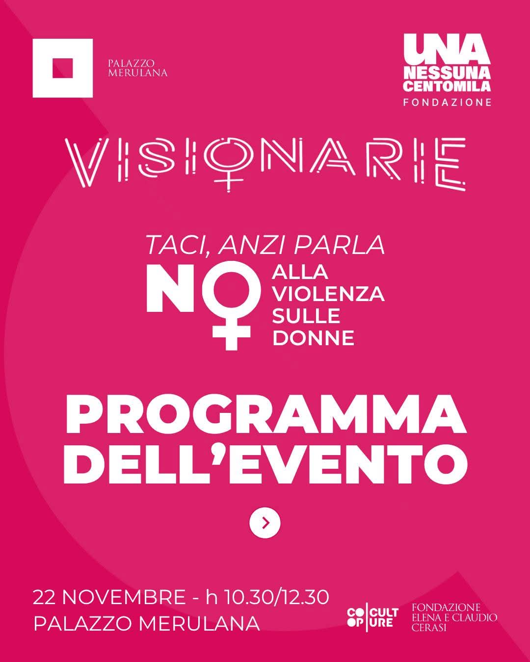 Palazzo Merulana, nato dalla sinergia tra Fondazione Elena e Claudio Cerasi e CoopCulture, ha voluto fortemente accogliere ancora una volta Visionarie in occasione della Giornata Internazionale per l’eliminazione della violenza contro le donne perché crede fortemente nel potere trasformativo della cultura e nel ruolo attivo che anche i luoghi d’arte devono assumere nei confronti delle grandi sfide sociali del nostro tempo.